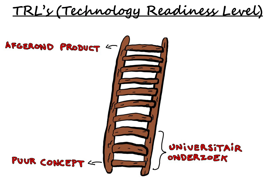 Jammer genoeg meer dat tweede dan het eerste. Als een bedrijf met onze groep gaat samen werken, dan doen ze dat voor problemen die op de bedrijfsladder op wat ze noemen hele lage TRL’s staan (Technology Readiness Level). Die levels gaan van 1 (een puur conceptueel theoretisch plannetje) tot 10 (een product dat in de schappen ligt). Met universitair onderzoek zit je op TRL’s 1-3. In de realiteit is de samenwerking die wij hebben met de industrie zodanig dat wij proefballonnetjes met ideeën opgooien waar zij met hagel op schieten. Daar bedoel ik mee dat de industrie erbij gebaat is als wij in de wetenschap heel veel dingen proberen. Innovatie is nu eenmaal een complex proces. De industrie probeert daarbij zoveel mogelijk ideeën op te rapen. Als je er eerlijk naar kijkt, is dat onze rol in de grotere schaal der dingen: Wij zijn één van de groepen die veel van dat soort proefballonnetjes tot een breder niveau proberen uit te werken om te kijken of daar wat te halen valt. Je kunt vandaag de dag geen wetenschap meer bedrijven in Nederland zonder dat je in gesprek bent over de toepassingen; veel van ons geld moet namelijk door de industrie opgehoest worden. Dit is ook het gedrag wat de industrie van de wetenschap verwacht. Het is niet van: “We moeten dit gaan maken, en allemaal oogkleppen op.” Nee, we willen juist vanuit de academie een wijde trechter volgooien met goede ideeën, en die filteren we tot we een paar dingen over houden die echt winstgevende, opschaalbare concepten kunnen worden. Daar gaan jaren overheen voordat die stappen gezet worden, zowel in de materialenindustrie als de biomedische industrie.