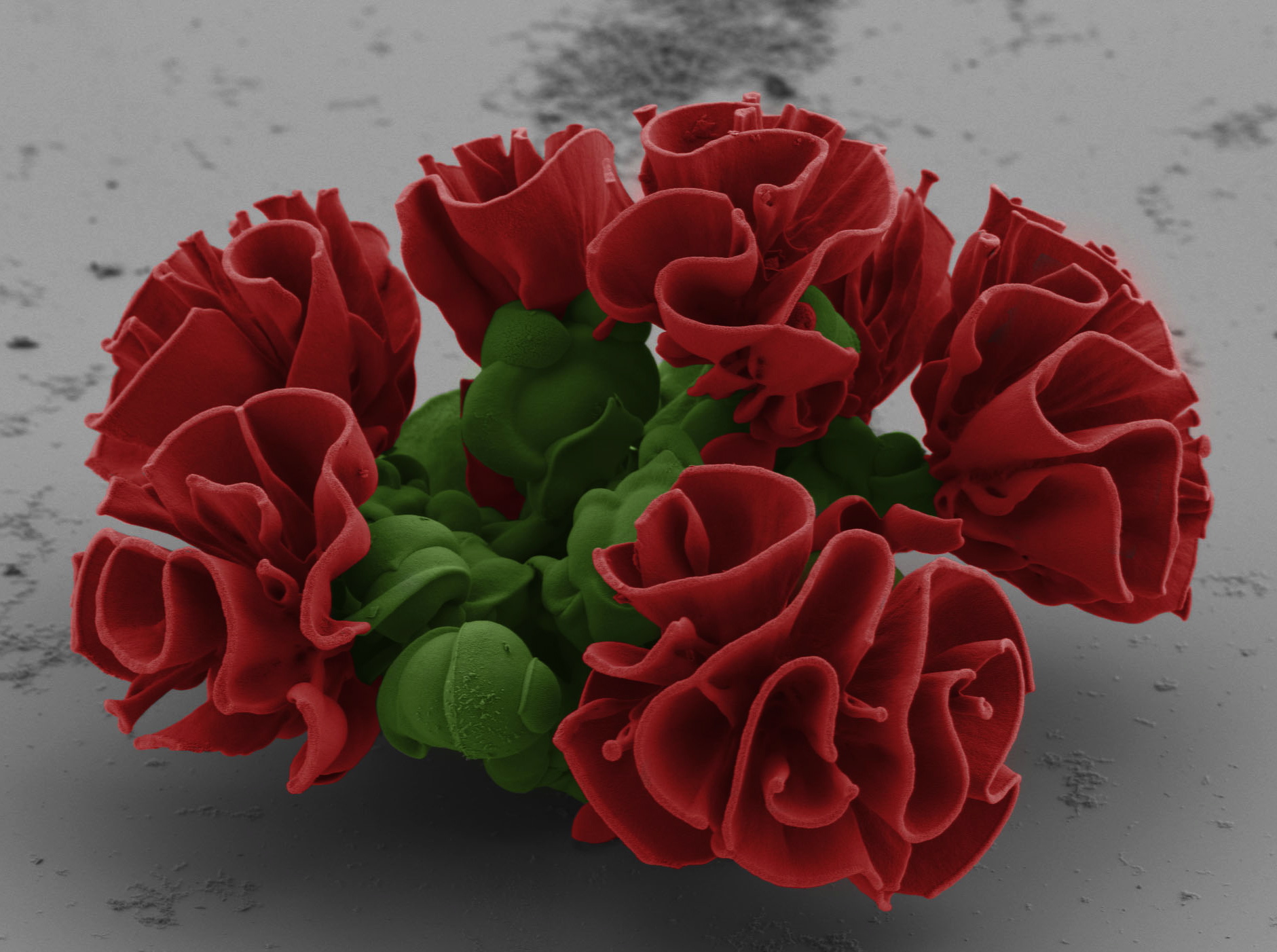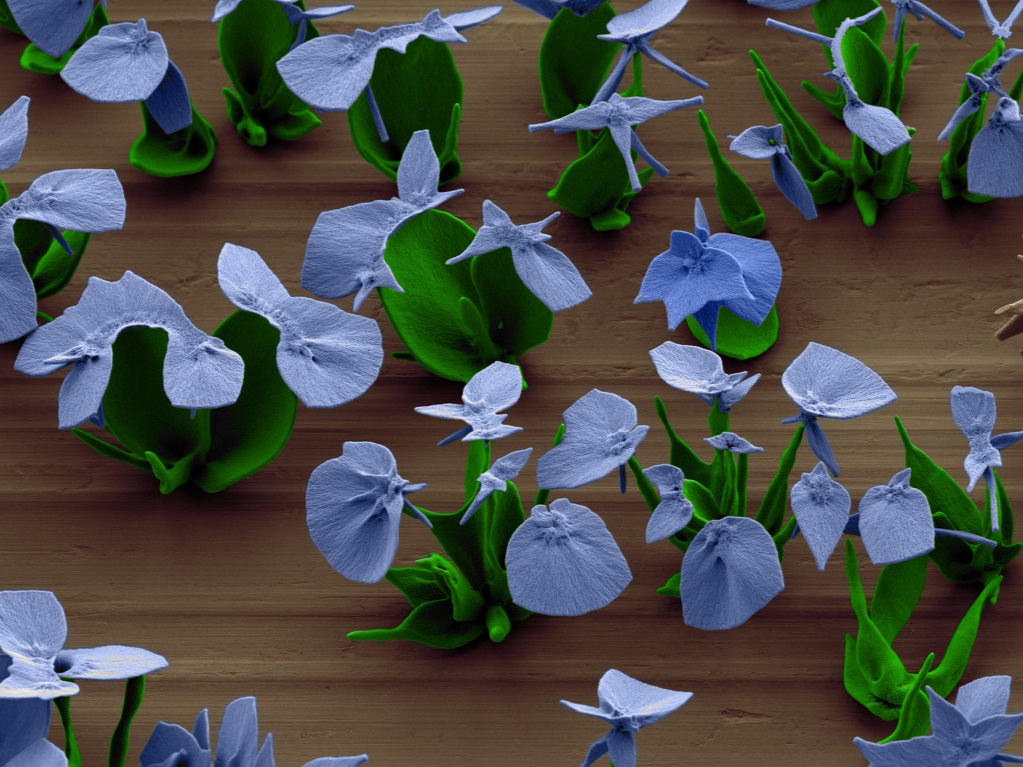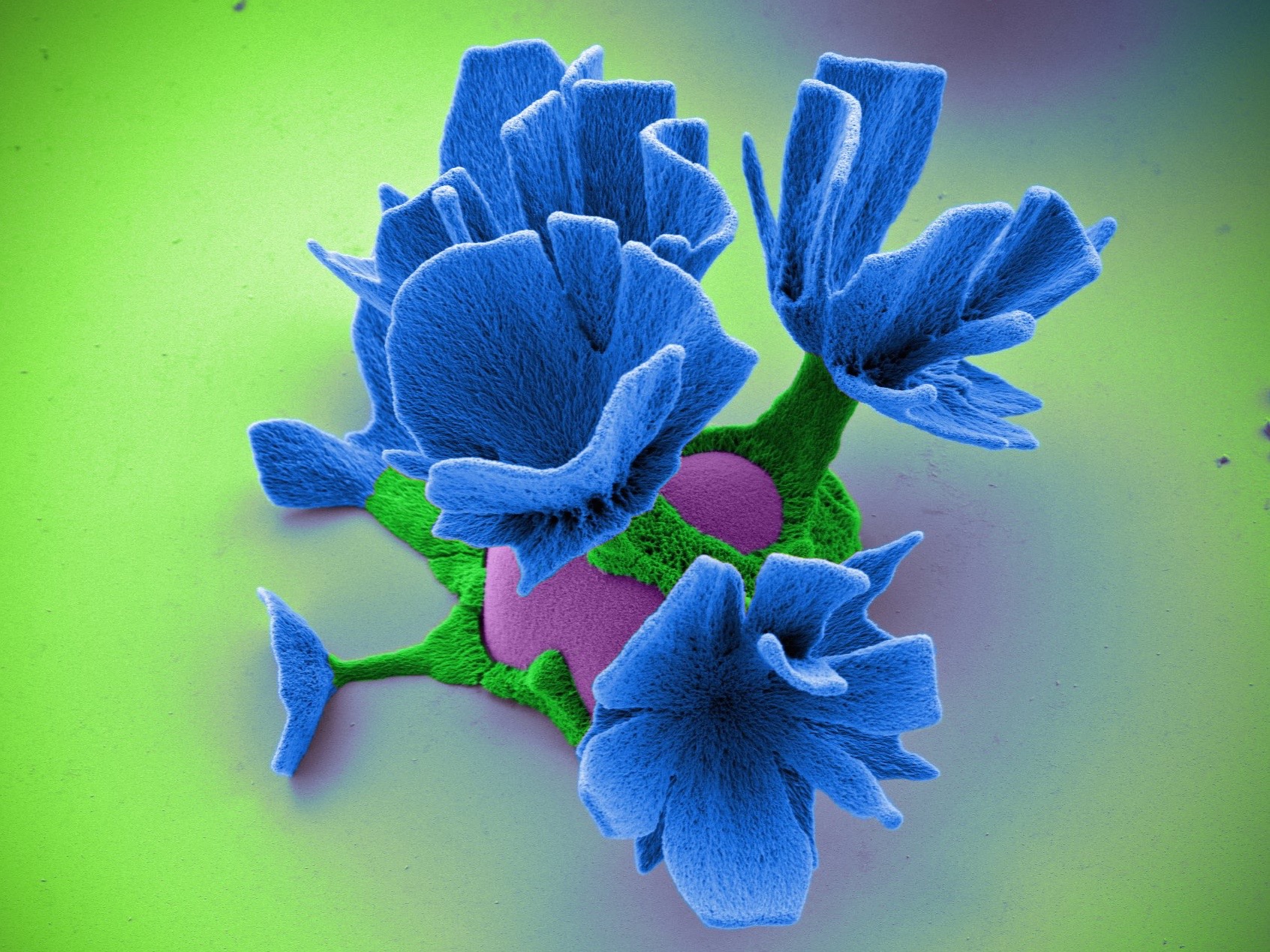 De gegroeide bloem-achtige patronen en complexe, prachtige structuren uit het lab. Afbeeldingen zijn gemaakt met een SEM, een microscoop die héél erg diep kan inzoomen. Credits: Wim Noorduin.