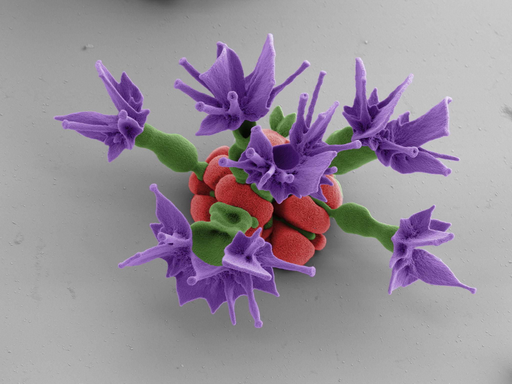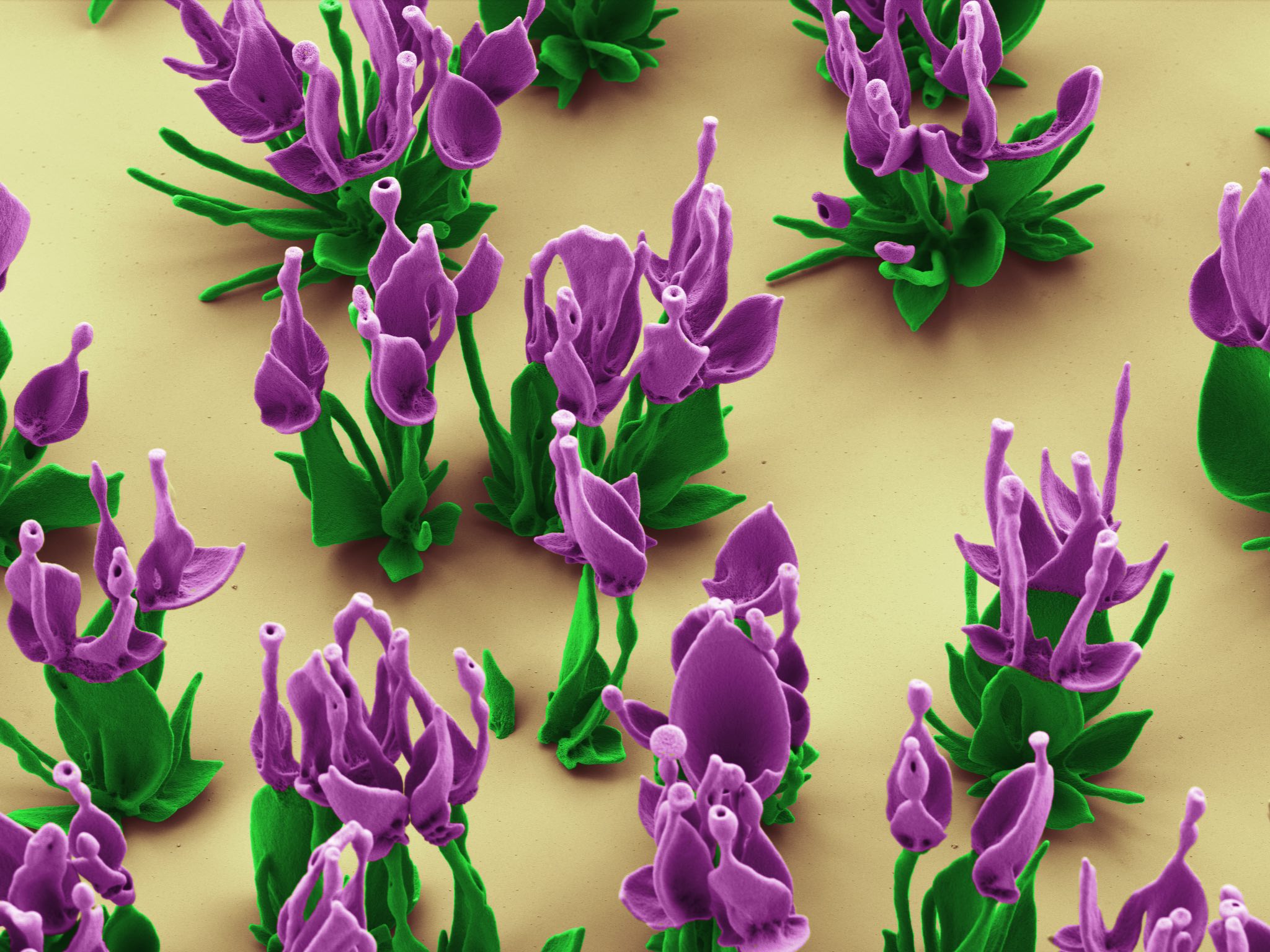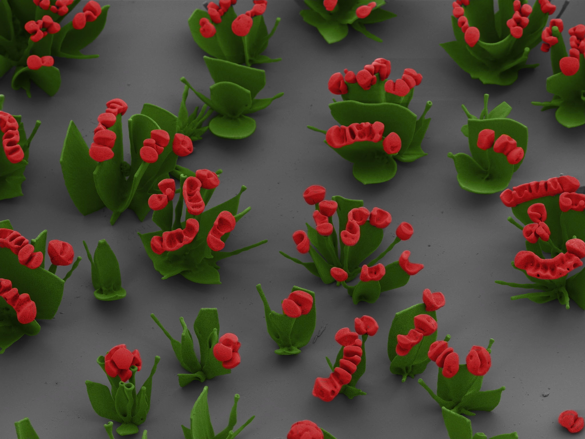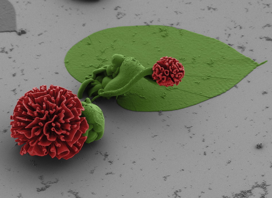 De gegroeide bloem-achtige patronen en complexe, prachtige structuren uit het lab. Afbeeldingen zijn gemaakt met een SEM, een microscoop die héél erg diep kan inzoomen. Credits: Wim Noorduin.
