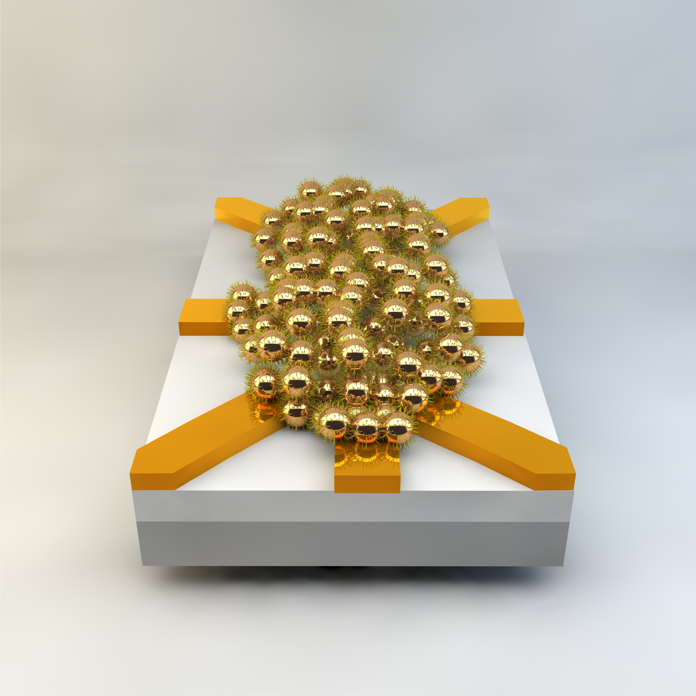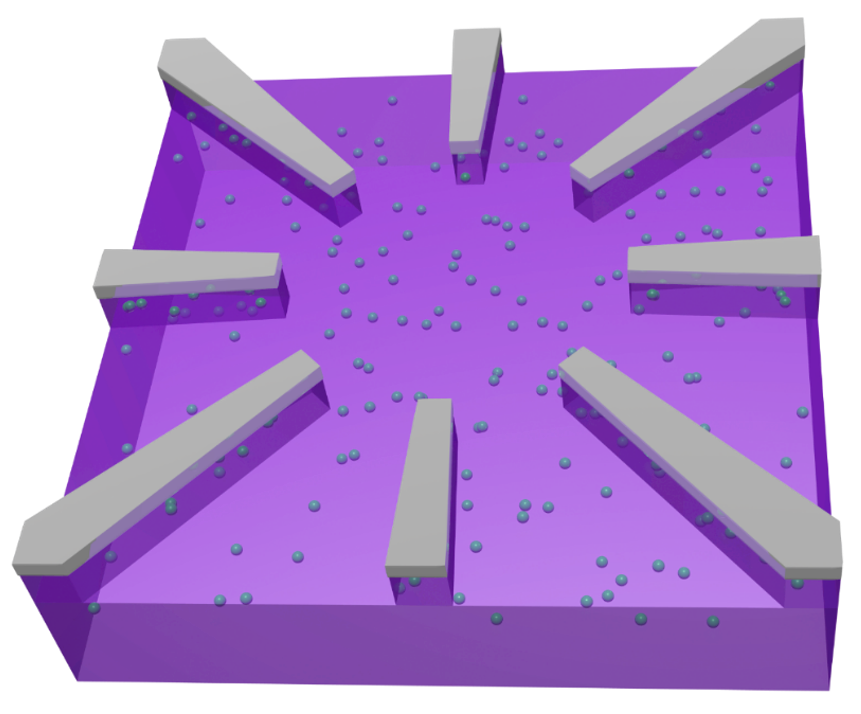 Huidige chip met elektroden als zonnestralen in een gedopeerd stuk halfgeleider (links) en een ouder concept waarbij een centraal eiland van gouden nanodeeltjes werd gebruikt (rechts). Credits: van der Wiel Lab.